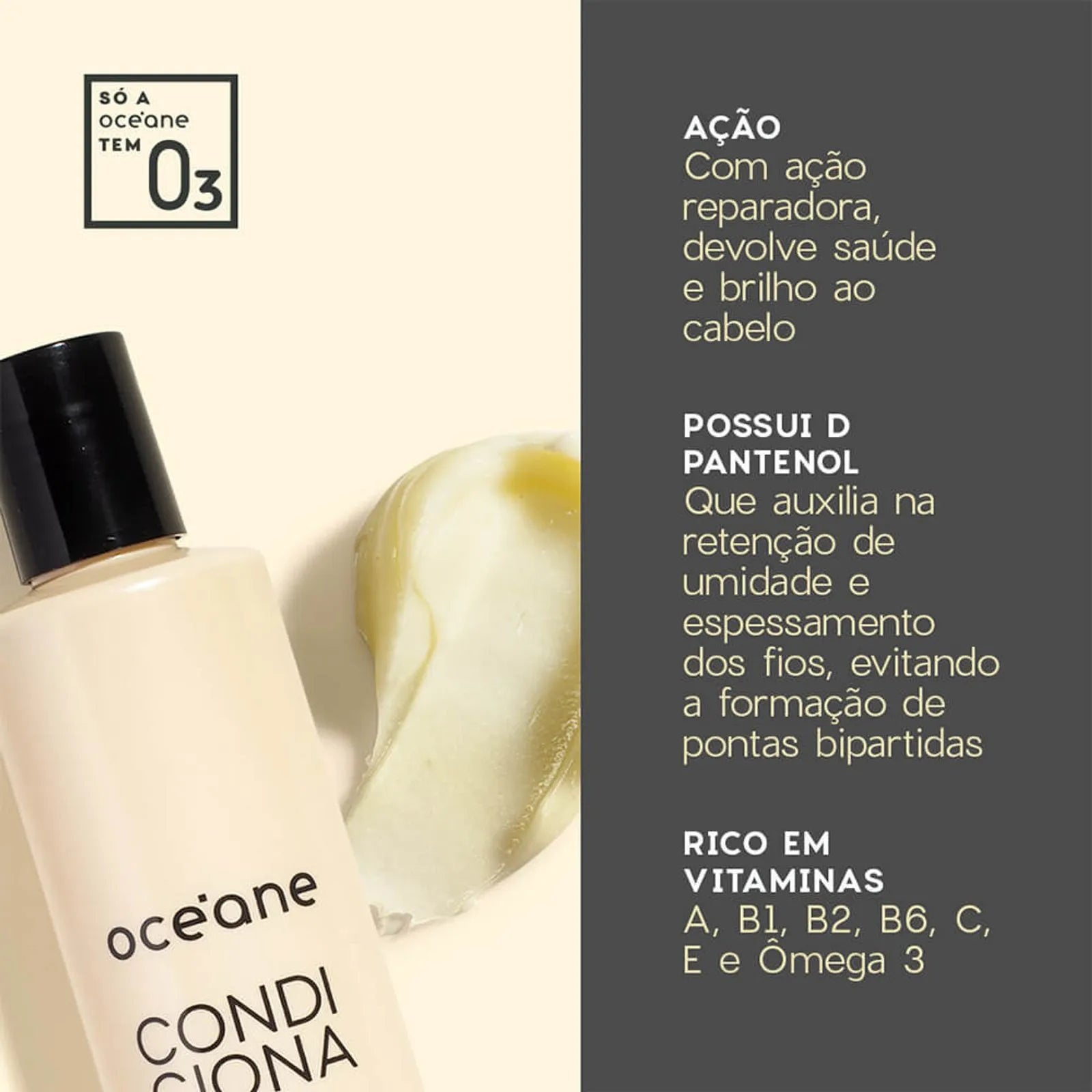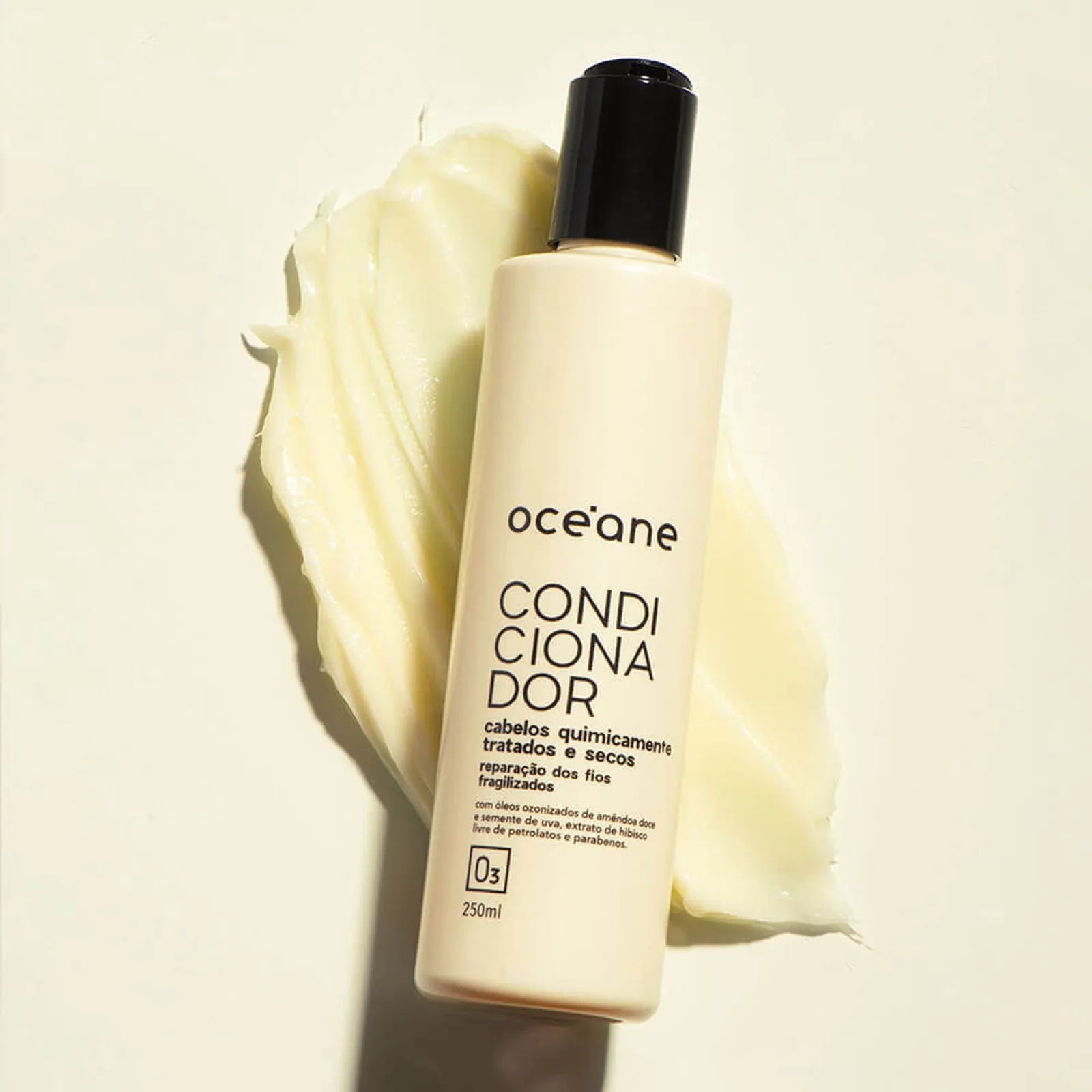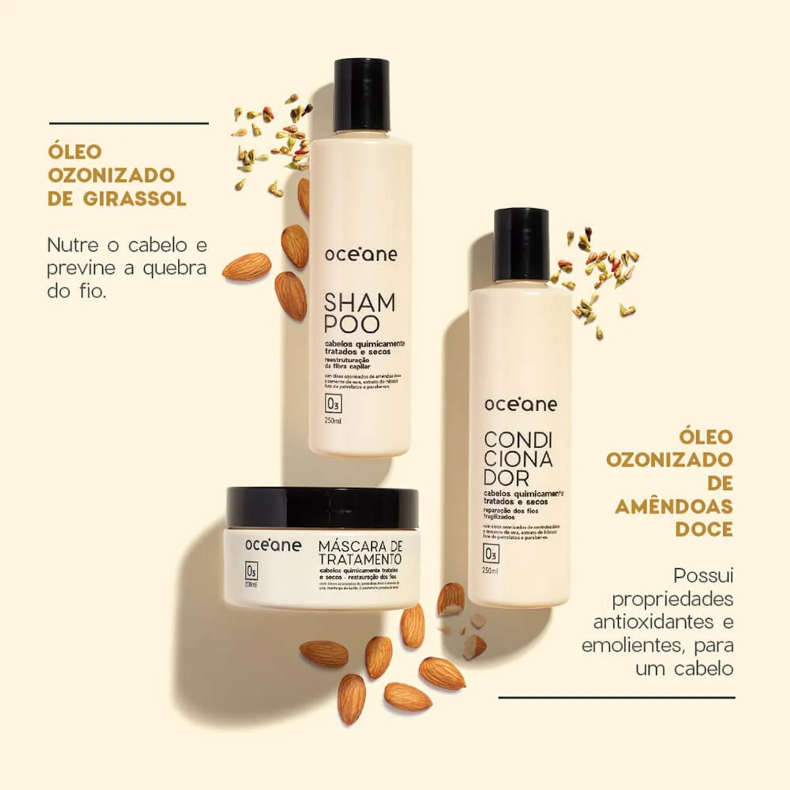 Além das combinações dos óleos ozonizados de amêndoas doce e semente de uva - ricos em vitaminas, o condicionador para cabelos secos e quimicamente tratados apresenta em sua composição a manteiga de karitê, ativo conhecido por suas propriedades emolientes que ajudam a devolver a quantidade de óleo ideal para dar maciez e hidratação aos fios ressecados.